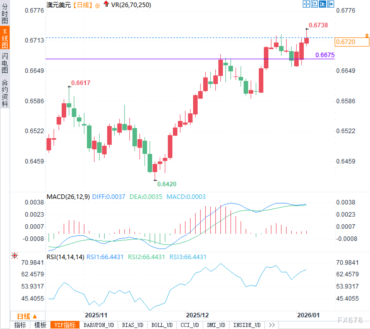 美元端仍有部分支撑,澳元端则等待通胀与景气数据来确认偏鹰定价,双方都缺少立即把行情推向单边的确定性。技术结构上,从日线形态看,汇价自前期低点0.6420附近反弹后保持抬高的波段节奏,近期高点上探至0.6738一带,但0.6740附近的压力在当日再次体现为“触及后回撤”。图形上0.6675一线可视作近期多空分歧较集中的参考区域:上方反复测试压力意味着多头需要新的基本面催化,才能把“反弹”升级为“趋势延展”;下方若出现回撤,是否仍能在前期突破区域附近获得承接,将反映市场对澳洲联储偏鹰定价的信心强弱。动能指标方面,RSI位于约66附近,显示短线偏强但已接近更敏感的拥挤区;MACD仍在零轴上方、柱体幅度不大,意味着趋势尚在但加速意愿有限。综合这些信号,更贴近当下的描述是“强势震荡”,而不是顺畅单边。