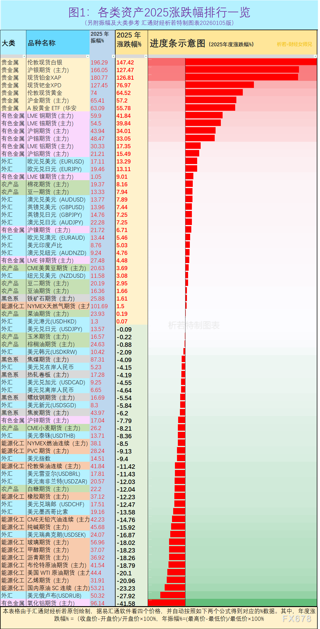 以下两张图,共列72个关键资产品种,包括贵金属、基本金属、外汇、能源化工、黑色系、农产品各大类,分别按照2025年涨跌幅%降序排序,以及大类分类展示+2026年机构预测价格走势概述。汇通财经析若原创特制图表,作为年终专题启读篇,为您汇总回顾过去展望未来。